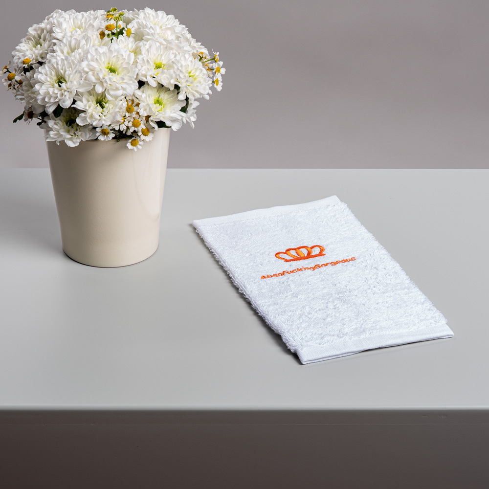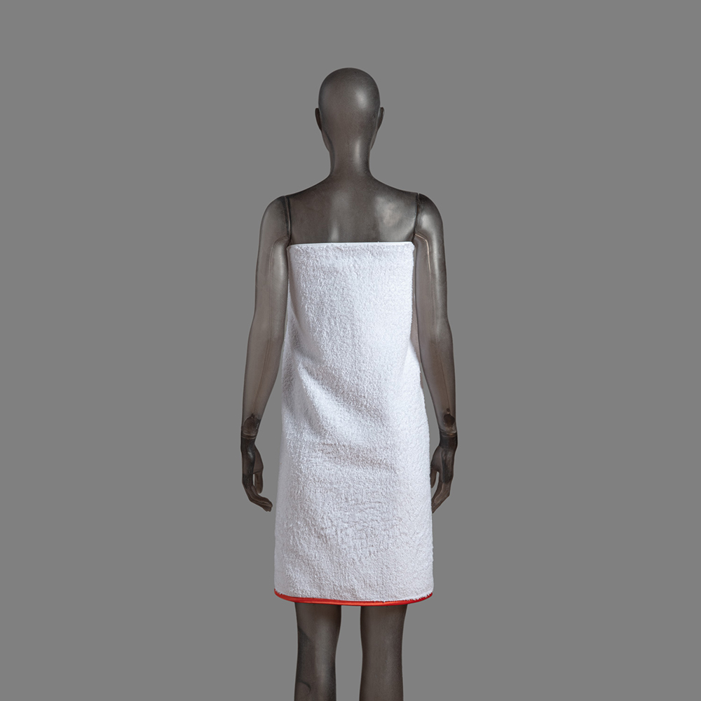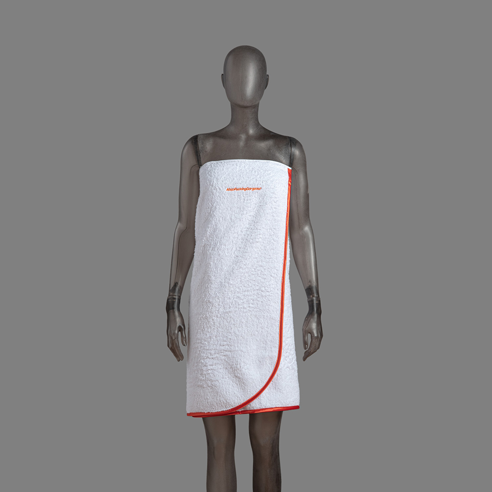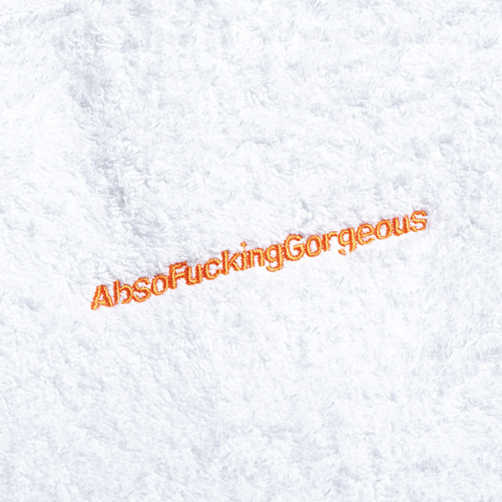 White Terry Strapless Bathrobe & Hand Towel Set, With Orange Quote Embroidery