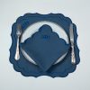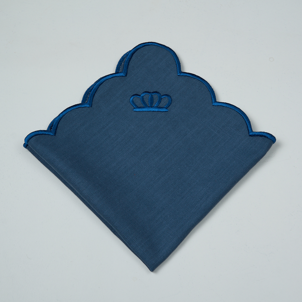 Elegant scalloped table napkin in deep blue, featuring a delicately embroidered crown motif and tonal piping along the curved edges. Its distinctive silhouette and refined detailing add a graceful and fresh touch to any dining setting, combining timeless elegance with effortless charm.