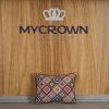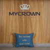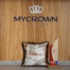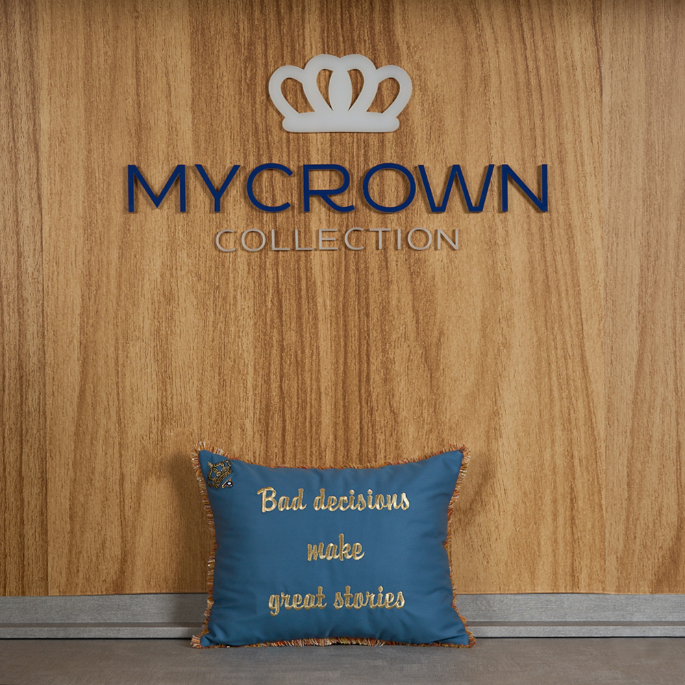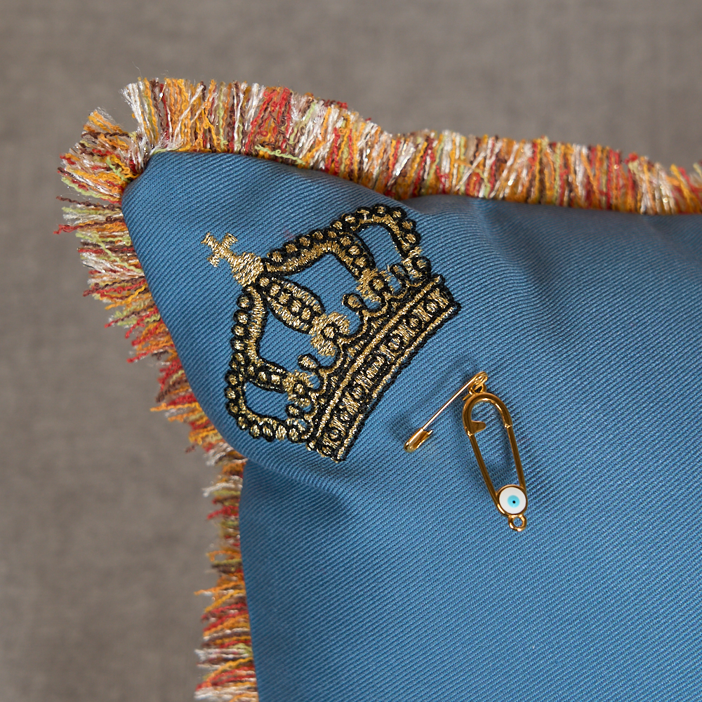 Decorative cushion cover crafted from a petrol blue fabric, featuring gold embroidery, finished with colorful fringed edges and a signature crown detail. A distinctive piece that enhances any room.