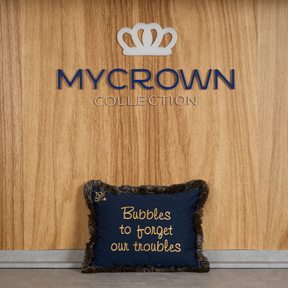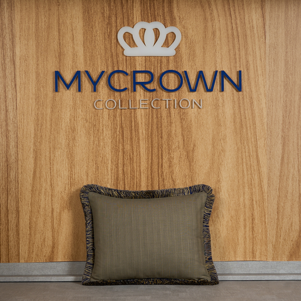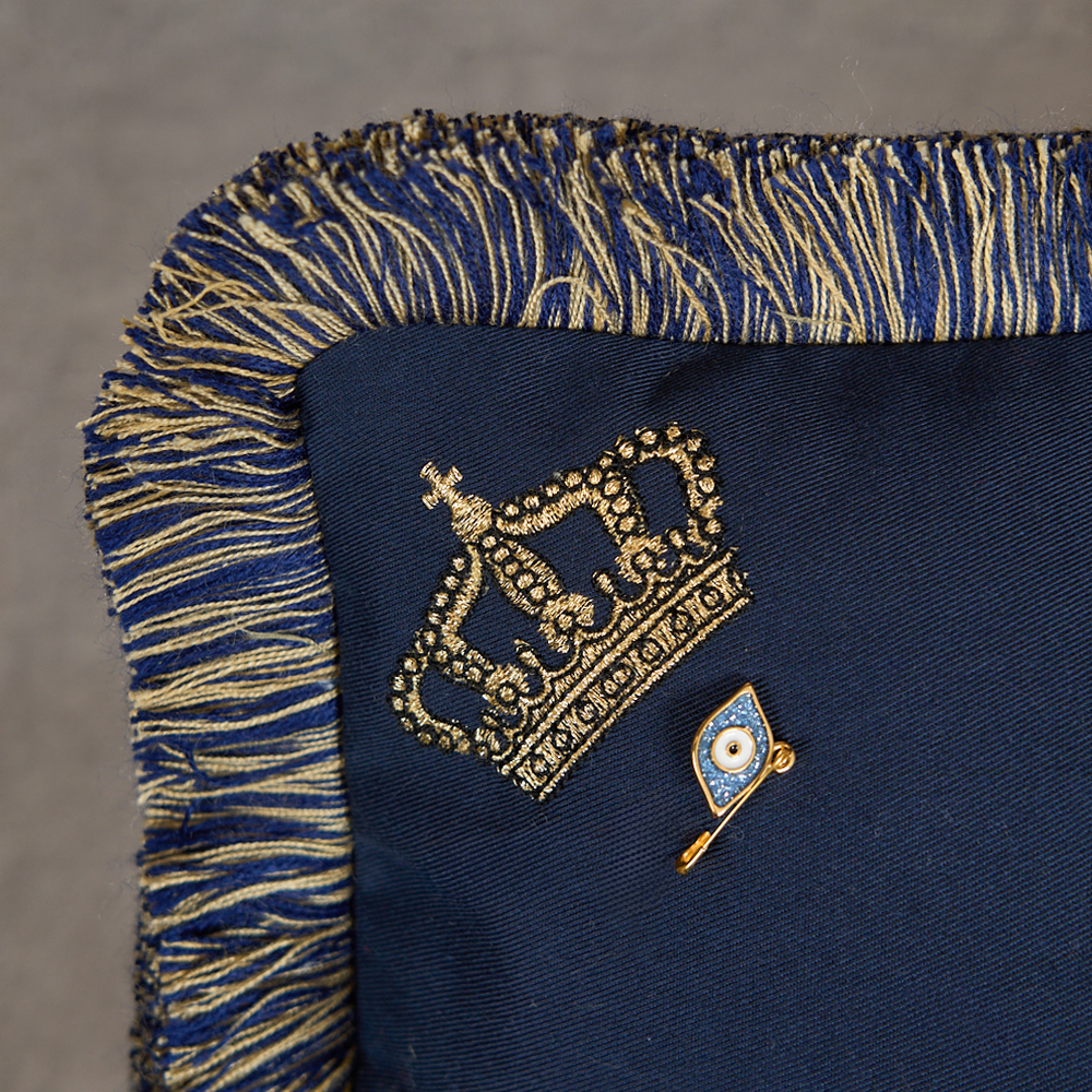 Decorative cushion cover crafted from a deep navy fabric, featuring gold embroidery, finished with rich fringed edges and an embroidered crown detail. A characterful statement piece that elevates any space.