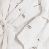 White terry bathrobe with a classic collar, featuring a grey embroidered crown with an eye motif, symbolizing protection and elegance. A subtle version of the embroidery is placed on the front, while the back features a larger, more striking design that adds a refined and elegant touch.