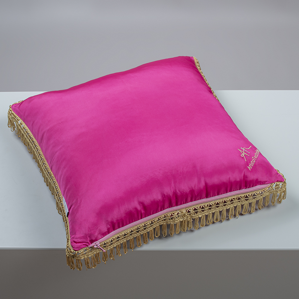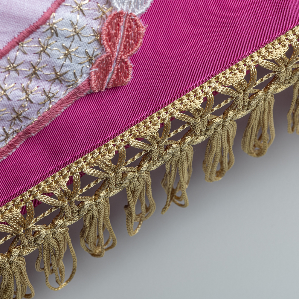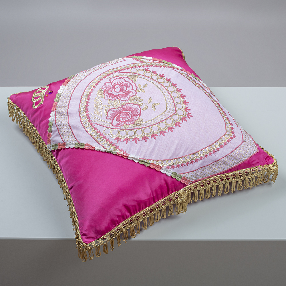 Repurposed Vintage White & Pink Embroidered Fabric Crafted Into A Pillowcase, With Golden Crown Embroidery & Fringes, In Collaboration With AristoTechnima