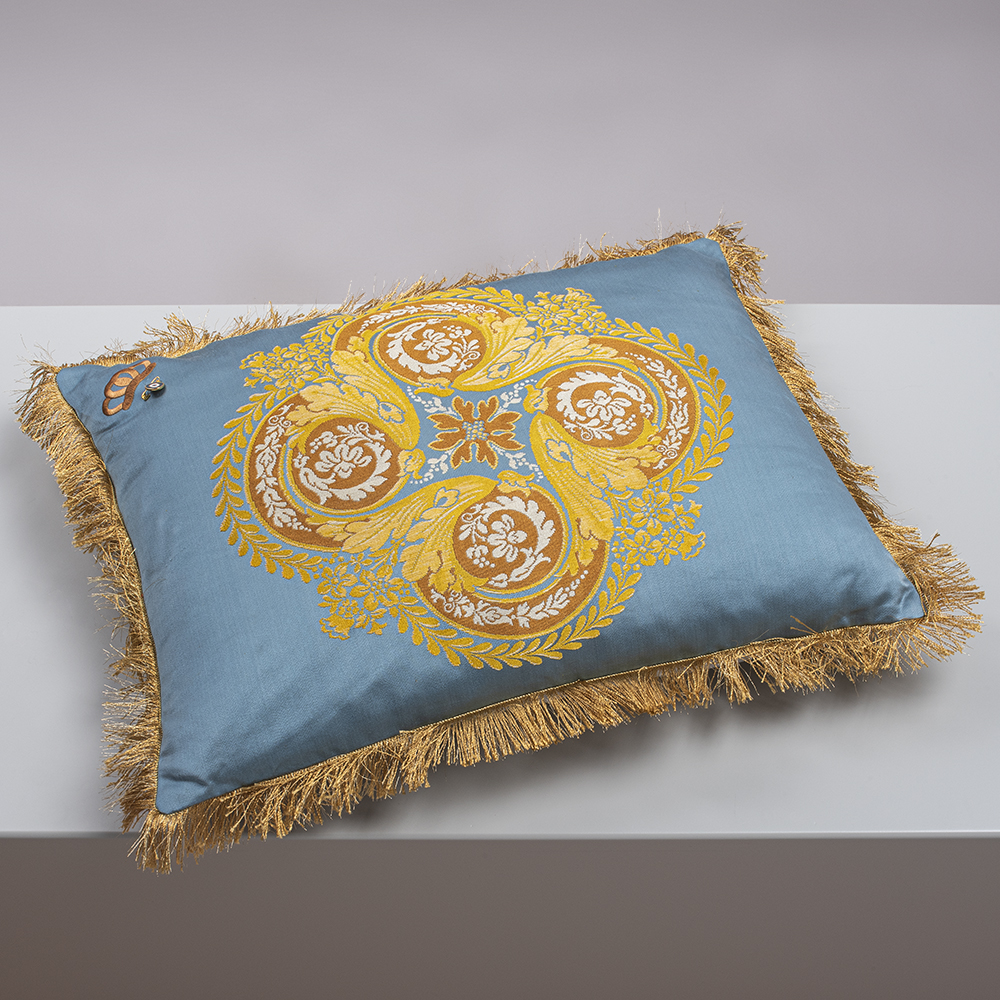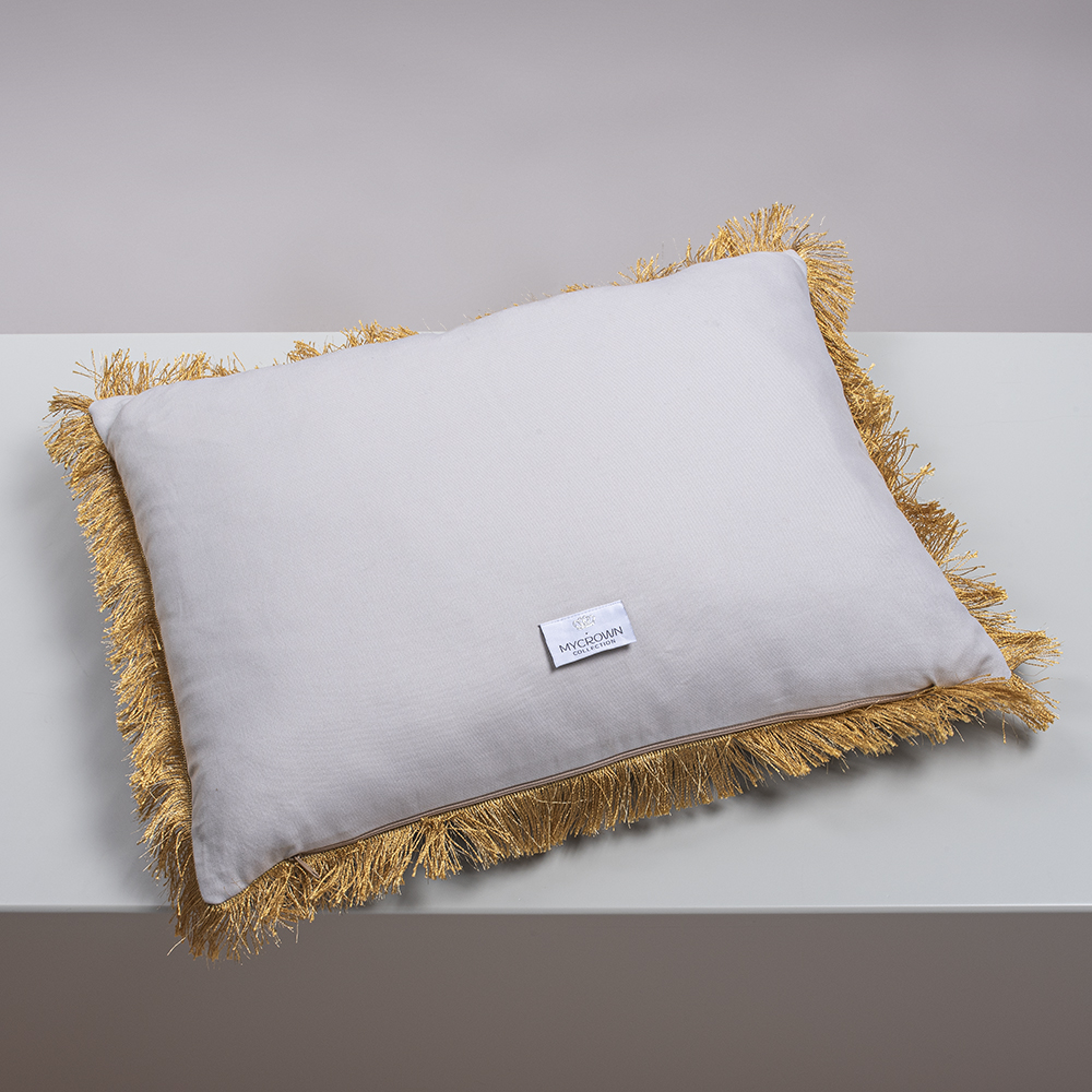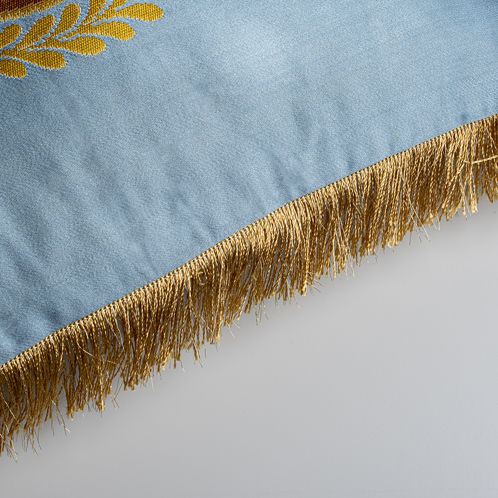 Sky Blue Sustainable Pillowcase Made Of Reused Fabric, With Golden Floral Pattern, Crown Embroidery & Fringes