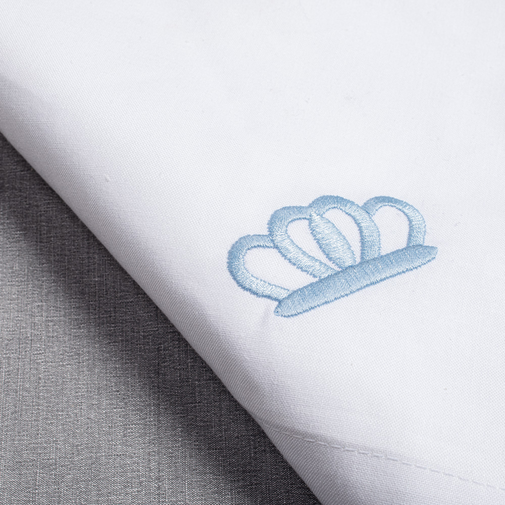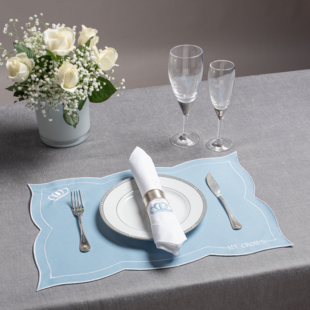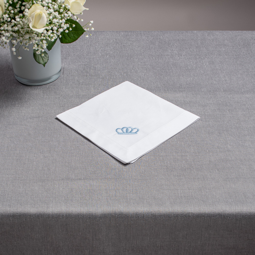 Elegant table napkin in white, accented with an embroidered crown motif in light blue. A refined detail that elevates any dining setting with timeless sophistication and subtle luxury.