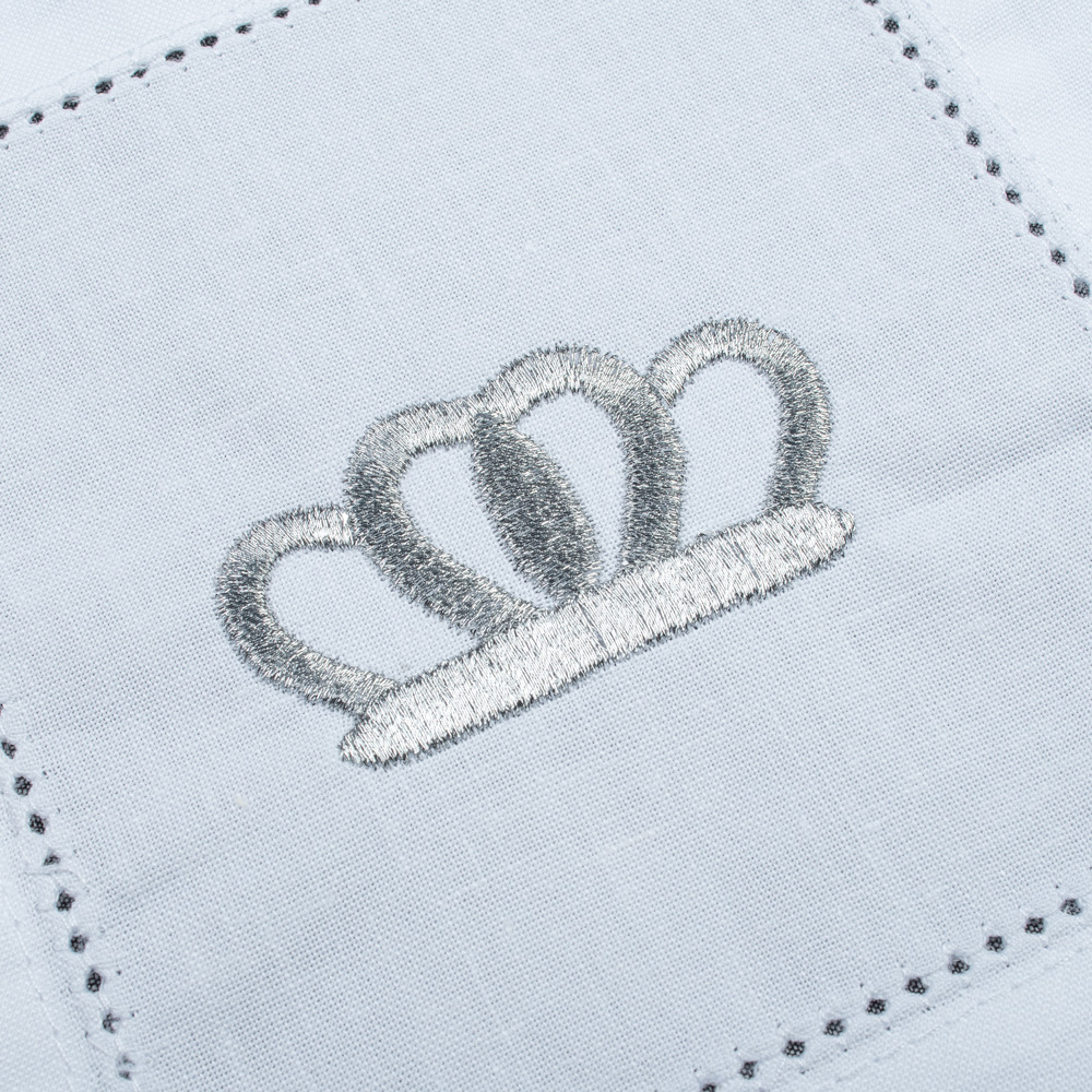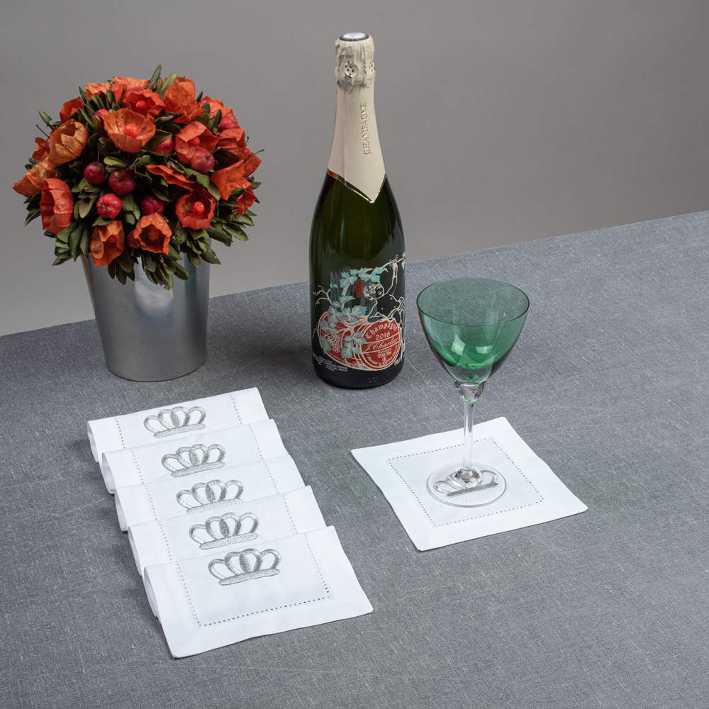 Set Of 6 White Cocktail Napkins, With Silver Embroidered Crown