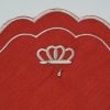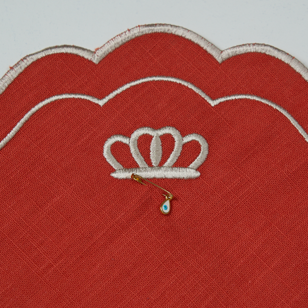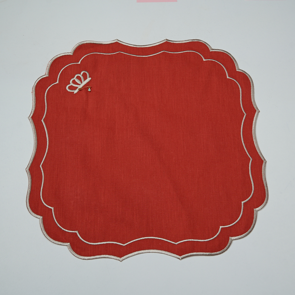 Elegant scalloped placemat in vibrant orange, featuring a delicately embroidered crown motif and ivory piping that follows its sculpted edges. Its layered silhouette and refined detailing add a graceful and fresh touch to any dining setting, combining timeless elegance with effortless charm.