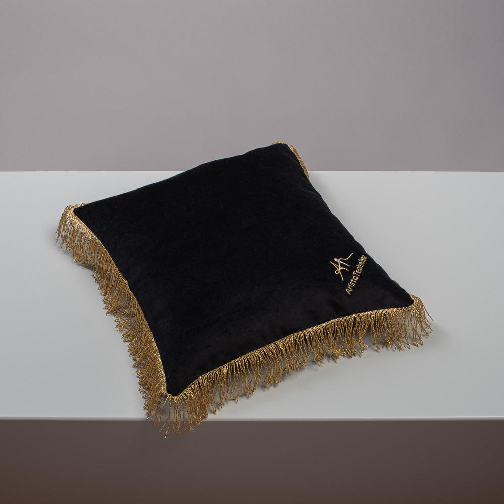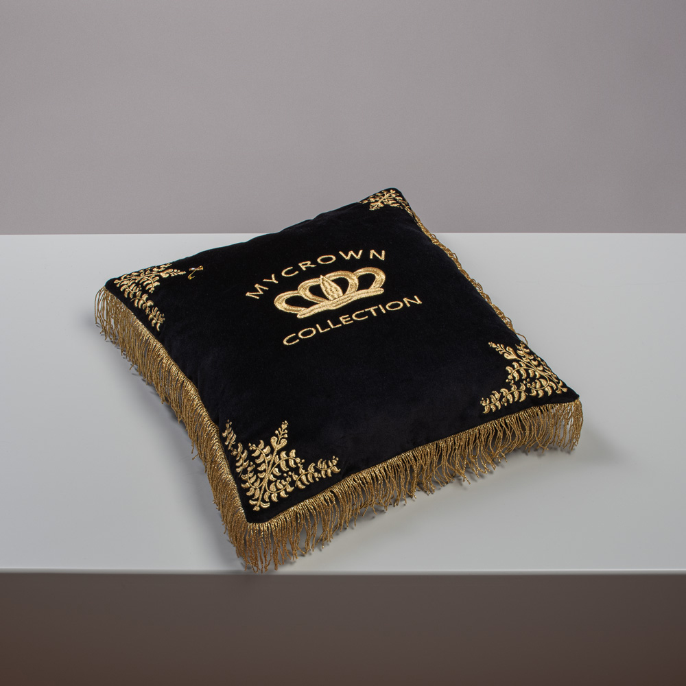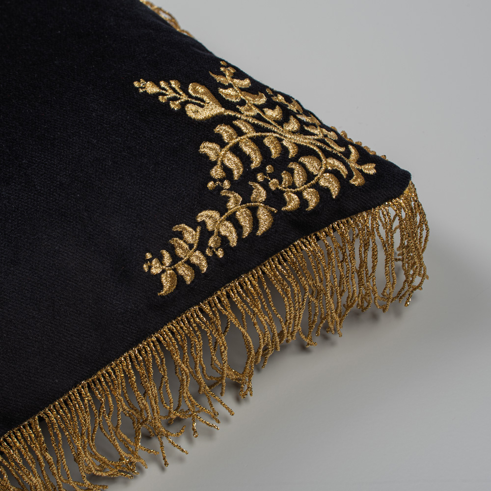 Black Velvet Pillowcase, With Golden Metallic Thread Embroidery & Golden Fringes, In Collaboration With AristoTechnima